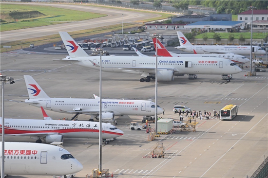 圖說:今日上午,東航接收的兩架C919客機(jī)在虹橋機(jī)場停機(jī)坪上,準(zhǔn)備執(zhí)行滬蓉航線。圖/張弘歷