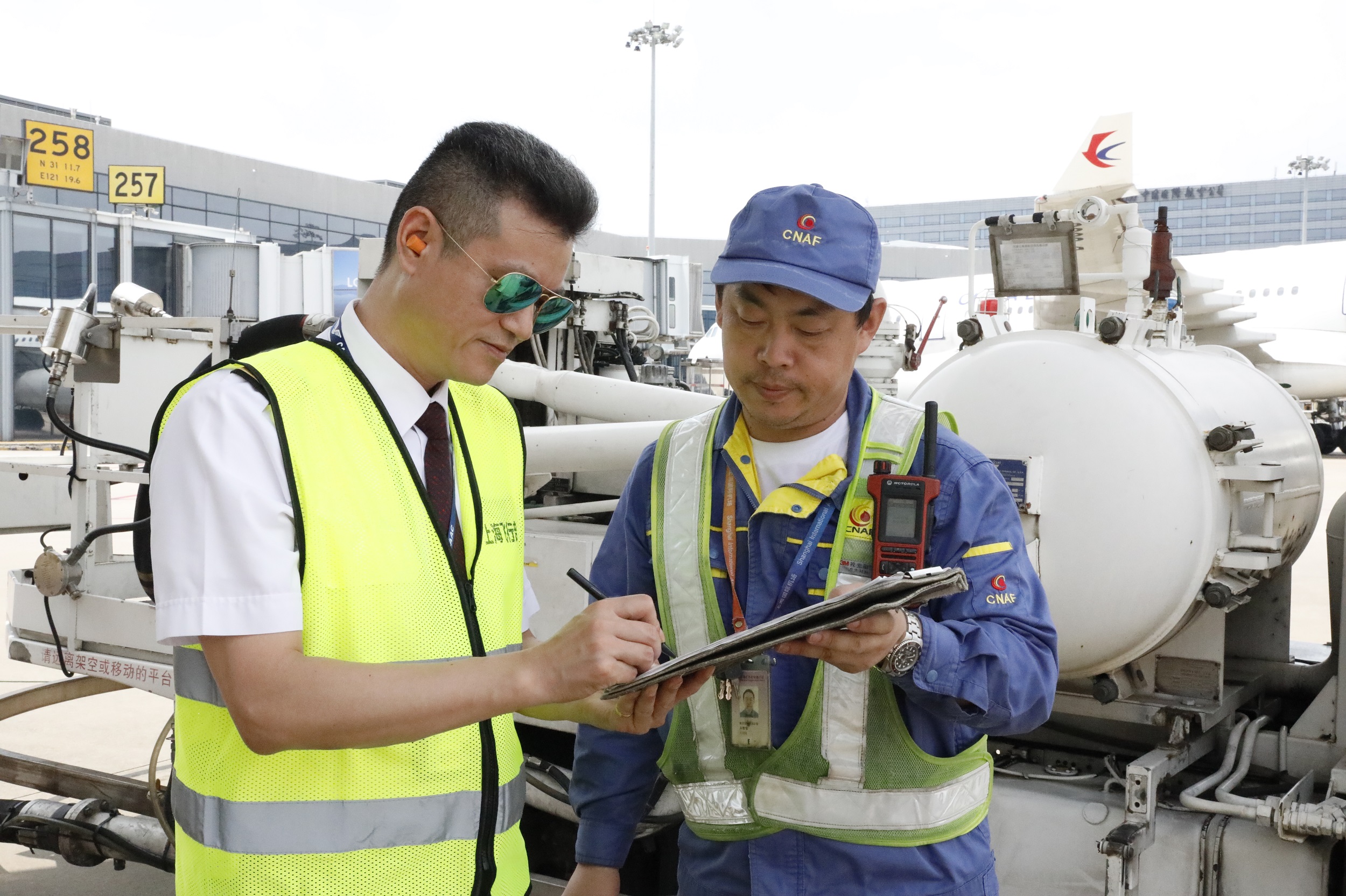 航班起飛前,機務工程師與東航A350機長季紅華進行最后的工作交接與確認