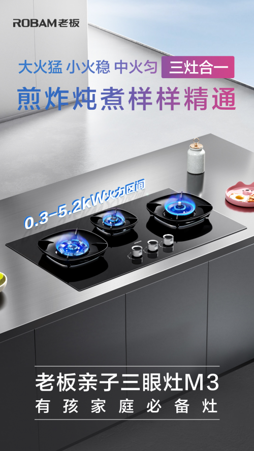有娃家庭人口多烹飪任務重,孩子吃的小分量食物烹飪難度大,且多代同堂對烹飪技法要求高。老板親子三眼灶M3的發(fā)布,讓眾多難題迎刃而解,烹飪變得趣味無窮,廚房生活更輕松。