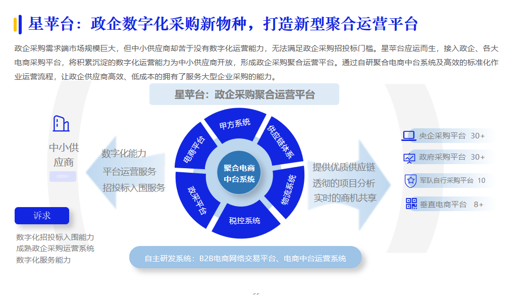 業(yè)務+數(shù)據(jù)的雙中臺模式,也是今年技術(shù)服務商在中臺方面的創(chuàng)新看點。從業(yè)務系統(tǒng)獲取的信息經(jīng)過數(shù)據(jù)中臺的處理,再經(jīng)過業(yè)務中臺的分析后,為企業(yè)提供智能決策支持。例如,星蘋臺通過自研聚合電商中臺系統(tǒng),接入政企、各大電商采購平臺,將積累沉淀的數(shù)字化運營能力為中小供應商開放,讓其擁有了服務大型企業(yè)采購的能力。