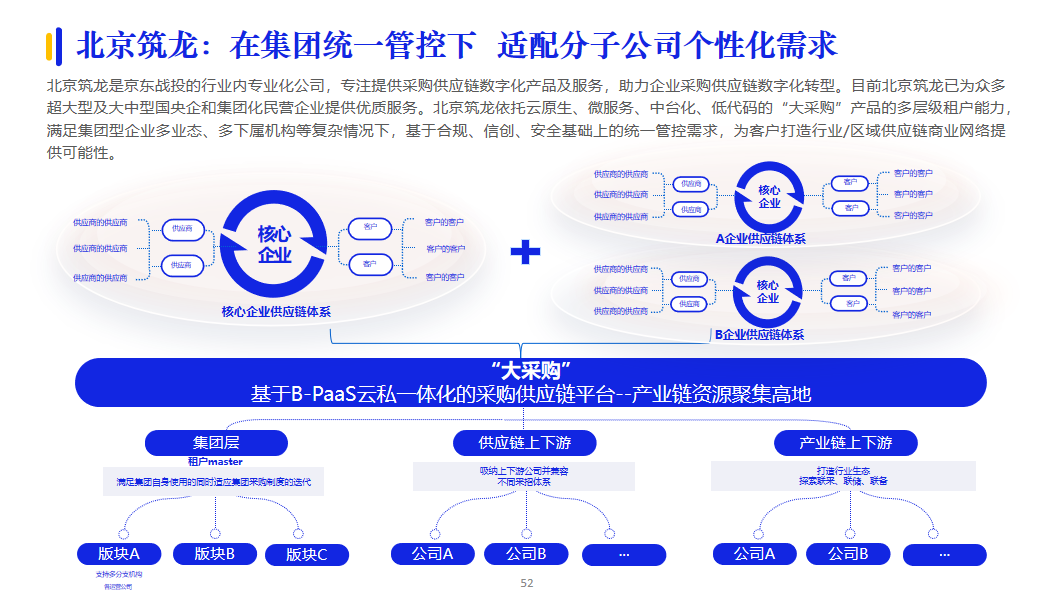 針對企業(yè)既要滿足標準化,又要滿足定制化業(yè)務需求,PaaS提供的服務更具有拓展性、集中性、適配性更強。北京筑龍基于多租戶體系,構(gòu)建了大采購云私一體化B-PaaS平臺,既滿足多層級集中管理管控需求,又為下屬管理及執(zhí)行機構(gòu)提供更多個性化、自主性選擇,進而適應集團多元化和業(yè)務單元專業(yè)化發(fā)展。