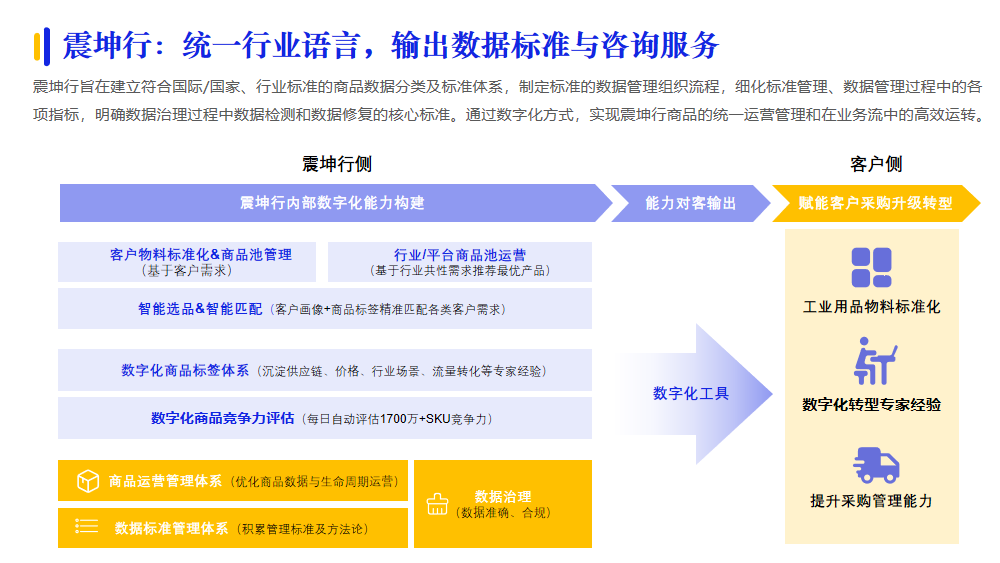 為企業(yè)提供場景、行業(yè)適配的產(chǎn)品與服務是供應商的基礎(chǔ)能力。可以借助AI等數(shù)字化技術(shù)服務,基于場景梳理的標準化實現(xiàn)商品智能匹配,已經(jīng)成為供應商服務升級的方向。例如:震坤行通過建立國際/國家、行業(yè)標準的商品數(shù)據(jù)分類及標準體系,明確數(shù)據(jù)治理過程中數(shù)據(jù)檢測和數(shù)據(jù)修復的核心標準,再基于場景梳理,建立數(shù)字化商品標簽體系,實現(xiàn)震坤行商品的統(tǒng)一運營管理和在業(yè)務流中的高效運轉(zhuǎn)。