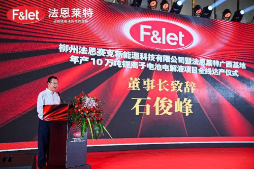 8月5日,柳州法恩賽克新能源科技有限公司暨法恩萊特廣西基地年產10萬噸鋰離子電池電解液項目全線達產儀式在廣西柳州盛大舉行。柳州市人民政府副市長湯振國,鹿寨縣人民政府縣長楊毅,法恩萊特公司董事長石俊峰,總經理邵俊華等出席儀式,共同見證這一重要時刻。