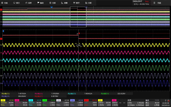 ·三相交流電分析,三相交流電廣泛應用于需要高能效或大功率的機電設備,如三相逆變器、電機、驅動器等。逆變器廣泛應用于家電、太陽能光伏發電、風能發電等,而在諸多汽車系統中,主驅、水泵、油箱冷卻系統都是由三相電所控制,對這些設備進行功率分析和電能質量測量必不可少。使用SDS6000 Pro分析三相電時,其中3路接高壓差分探頭測量電壓,3路接電流探頭測量電流,這樣不僅能直接觀測到實時波形,還能利用數學運算進行各種信號處理得到電流有效值、視在功率、波峰因數、諧波失真等參數。