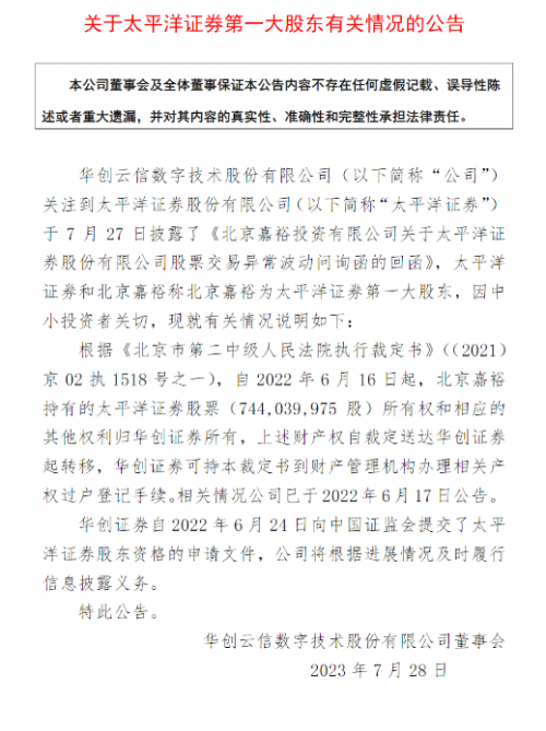7月28日,華創云信發布公告稱,根據法院執行裁定書,自2022年6月16日起,北京嘉裕持有的太平洋證券股票7.44億股所有權和相應的其他權利歸華創證券所有,上述財產權自裁定送達華創證券起轉移,華創證券可持本裁定書到財產管理機構辦理相關產權過戶登記手續。