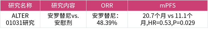 ALTER 01031的Ⅱ期隨機對照研究的結(jié)果表明,對比安慰劑,安羅替尼組的客觀緩解率(ORR)達到48.39%,可以顯著延長中位無進展生存期(mPFS)達9.6個月(20.7個月 vs. 11.1個月)[8],為晚期MTC患者帶來顯著的PFS及ORR獲益,并且安全性良好。安羅替尼甲狀腺髓樣癌適應(yīng)癥的獲批,打破了國內(nèi)甲狀腺髓樣癌無靶向藥可用的局面,給患者帶來新希望。