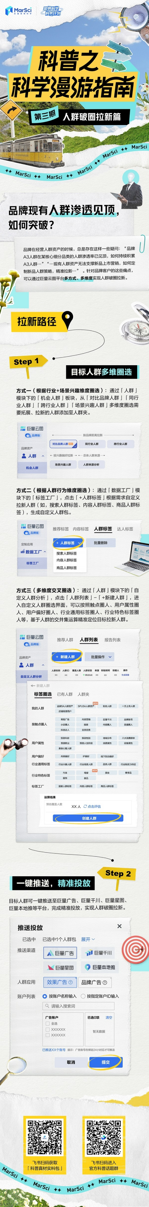 本期「科普之科學漫游指南」為品牌提供了關于人群破圈拉新的指導,告訴品牌在面對人群滲透見頂的情況下,如何借助巨量云圖實現多方式、多維度的人群破圈拉新。在巨量云圖的引領下,品牌可以實現對目標人群的精準洞察和定位,通過三種路徑對目標人群進行靈活圈選;選定人群后,即可一鍵推送至巨量廣告、巨量千川、巨量星圖、巨量本地推等平臺,將品牌信息精準傳遞給真正感興趣、有互動價值的人群。這不僅提高了品牌的知名度和影響力,更激發了潛在客戶的興趣和購買欲望。