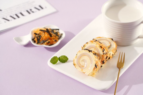 盼盼肉松海苔戚風卷,不愧是盼盼食品深耕烘焙產品的又一力作!外面滿滿的一層肉松與海苔,這絕妙搭配,讓整塊蛋糕卷的風味更上一個臺階!恰到好處的咸香口味,中和了甜點本會有的甜膩。第一眼看到松軟又帶有淡淡油潤的肉松上鋪著微脆的小片海苔,松軟鮮香,好吃又不膩,讓人忍不住深入挖掘,一探究竟!