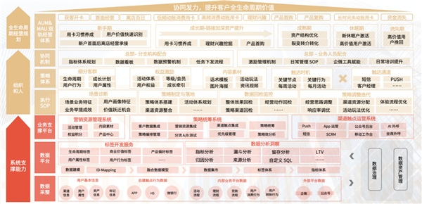 上圖為數字化經營能力全景圖,最上層為全生命周期經營規劃,即 AUM&MAU 雙軌經營體系,包括不同階段的主要運營目標,如新手期主要為用卡習慣養成、用戶價值快速識別、新戶首面后離店經營繼承等。