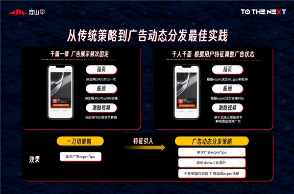 ▎閱讀行業:?為避免過往千篇一律的廣告展示影響用戶體驗,穿山甲基于GroMore獨特的用戶價值分組能力,借助用戶所看書籍類型、閱讀速度、在線時長、累計觀看廣告數量等不同參數,為開發者建立了一套用戶分層策略。通過“廣告動態分發”,根據用戶特征及時調整廣告狀態,在不影響用戶留存的情況下進一步提升廣告arpu,實現LTV最大化。