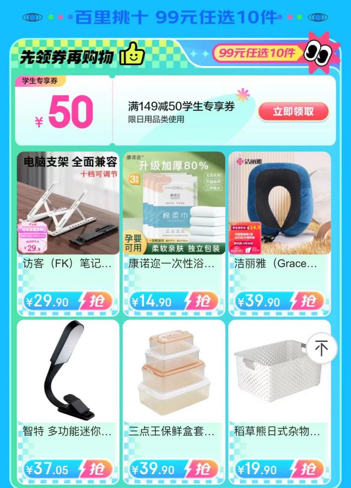 為了讓學生們省錢煥新,京東開學季特設“百里挑十 ”專區,雜物收納籃、筆記本電腦支架、泡腳盆、毛巾、水果刀、除螨噴霧等剛需好物99元任選10件,更有搬家打包收納袋、真空壓縮包、抽屜式桌面收納盒、衣服收納筐等海量商品享低至5折的學生折扣,為學生們帶來超值優惠。