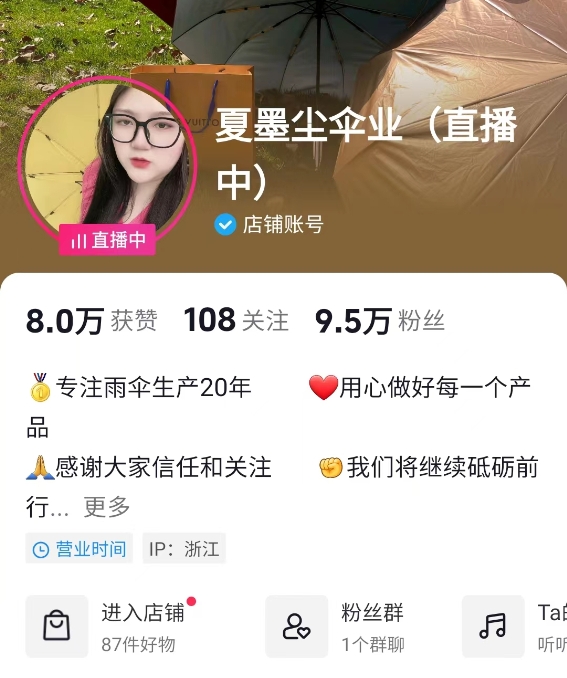其運營的名為@夏墨塵傘業 的抖音號,雖然顯示還不到10萬粉絲,但銷量卻好的驚人。“我們最火的時候,一天賣出過30萬單貨品,營業額過千萬。”鐘永平很自豪——這個銷售數據放到以前,他想都不敢想。他也從未想過,一個季節性極強的產品,就這么在浙江義烏做成了“爆款之王”。