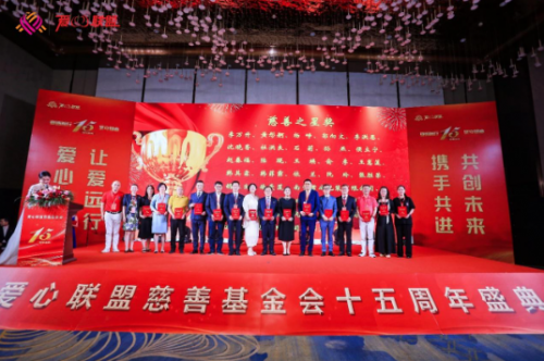 下午,愛心聯盟慈善基金會成立十五周年盛典隆重舉行。全國勞動模范、全國五一勞動獎章獲得者、全國道德模范、吉林省工商聯副主席、吉林省河南商會會長、愛心聯盟慈善基金會理事長李萬升,河南省政府駐上海辦副主任胡華杰,哈爾濱市政府駐上海辦經協處處長田磊,中國浦東干部學院黨建研究中心主任吳濤,上海中信國旅總經理羅良剛,山東馳恒投資發展有限公司董事長王久紅,昆山物流協會會長孫喜,來伊份股份有限公司高級副總裁趙漢利,新希望集團草根資本投資部部長許云龍,上海歐邦醫療管理有限公司創始人崔海茹,眼界(上海)健康管理有限公司創始人謝攖寧,浙江省有機產業協會理事長胡珊,上海妃魚股份高級副總裁李財鋒,愛心聯盟慈善基金會執行理事長楊崢,以及上海市工商聯直屬商會和各省市在滬異地商會秘書長等來自全國各地的精英和愛心聯盟成員300余人歡聚一堂,共同慶祝愛心聯盟慈善基金會成立十五周年。