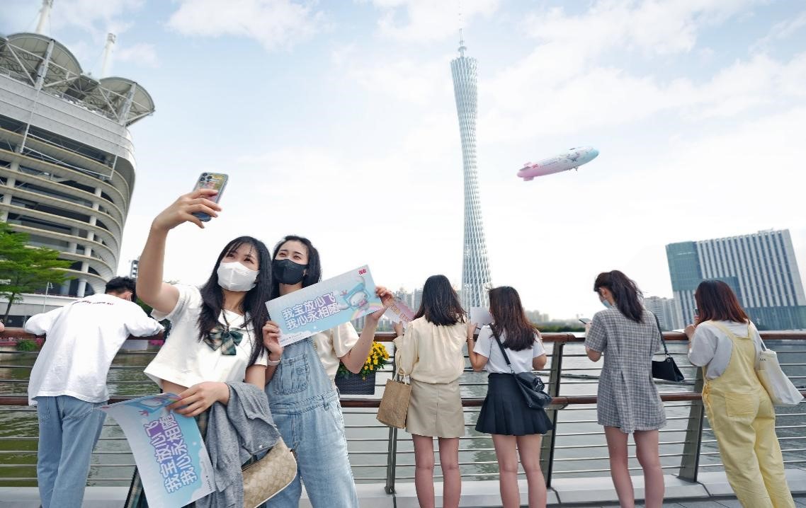 在“大耳狗20周年”期間,名創(chuàng)優(yōu)品于3月19日當(dāng)天獨(dú)家打造了一架豪華飛艇,把“大耳狗寵上天”。這架飛艇圍繞廣州塔、海心橋、獵德大橋環(huán)繞飛行,從下往上看飛艇的外觀,正是大耳狗20周年慶主題海報(bào)。隨著飛艇乘風(fēng)而上,大耳狗仿佛躲進(jìn)輕紗包裹般的云端里,沖著地面的人打趣逗樂(lè)。