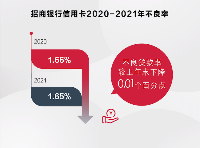 近年來,經濟承壓、共債風險、監管趨嚴、業務收緊等因素使信用卡行業的風險管控面臨較大壓力,但招行信用卡不良率穩中有降,風險平穩可控。據財報,2021年,招行信用卡新生成不良貸款292.06億元,同比減少32.35億元,信用卡不良率1.65%,較上年末下降0.01個百分點。