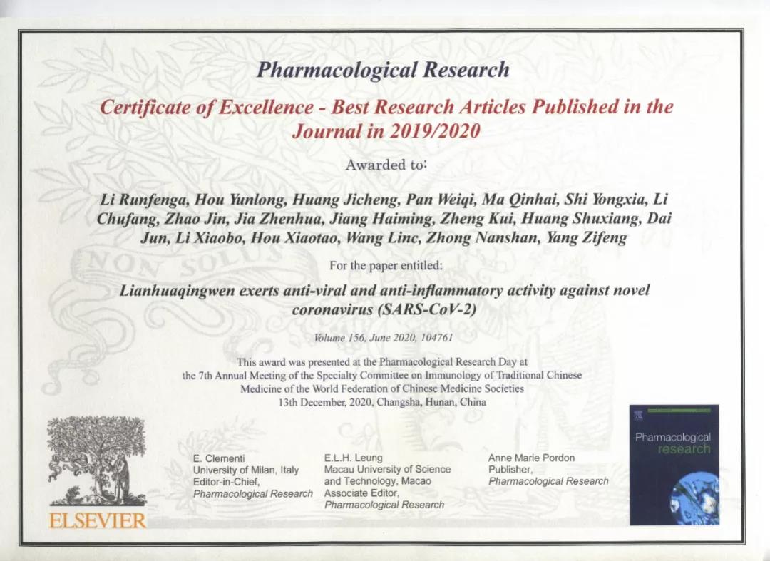 論文《連花清瘟對新型冠狀病毒具有抗病毒、抗炎作用》被國際期刊《藥理學研究》評選為2019-2020年度全球優秀論文獎