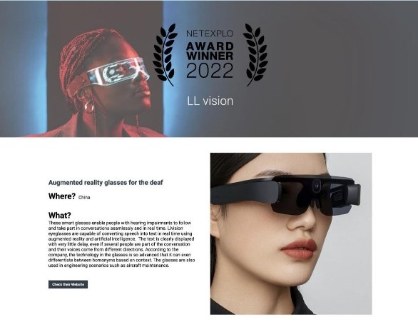 值得關注的是,在今年的評選中,亮亮視野智能AR字幕眼鏡成為唯一入選該獎的中國代表,也是AR領域的唯一代表。在活動期間Netexplo論壇官網面向全球觀眾進行了一個投票活動,從10項創新中選出年度最佳創新成果,亮亮視野智能AR字幕眼鏡脫穎而出,與第一名票數極其接近,獲得第二名,彰顯了大眾對它的肯定和期待。