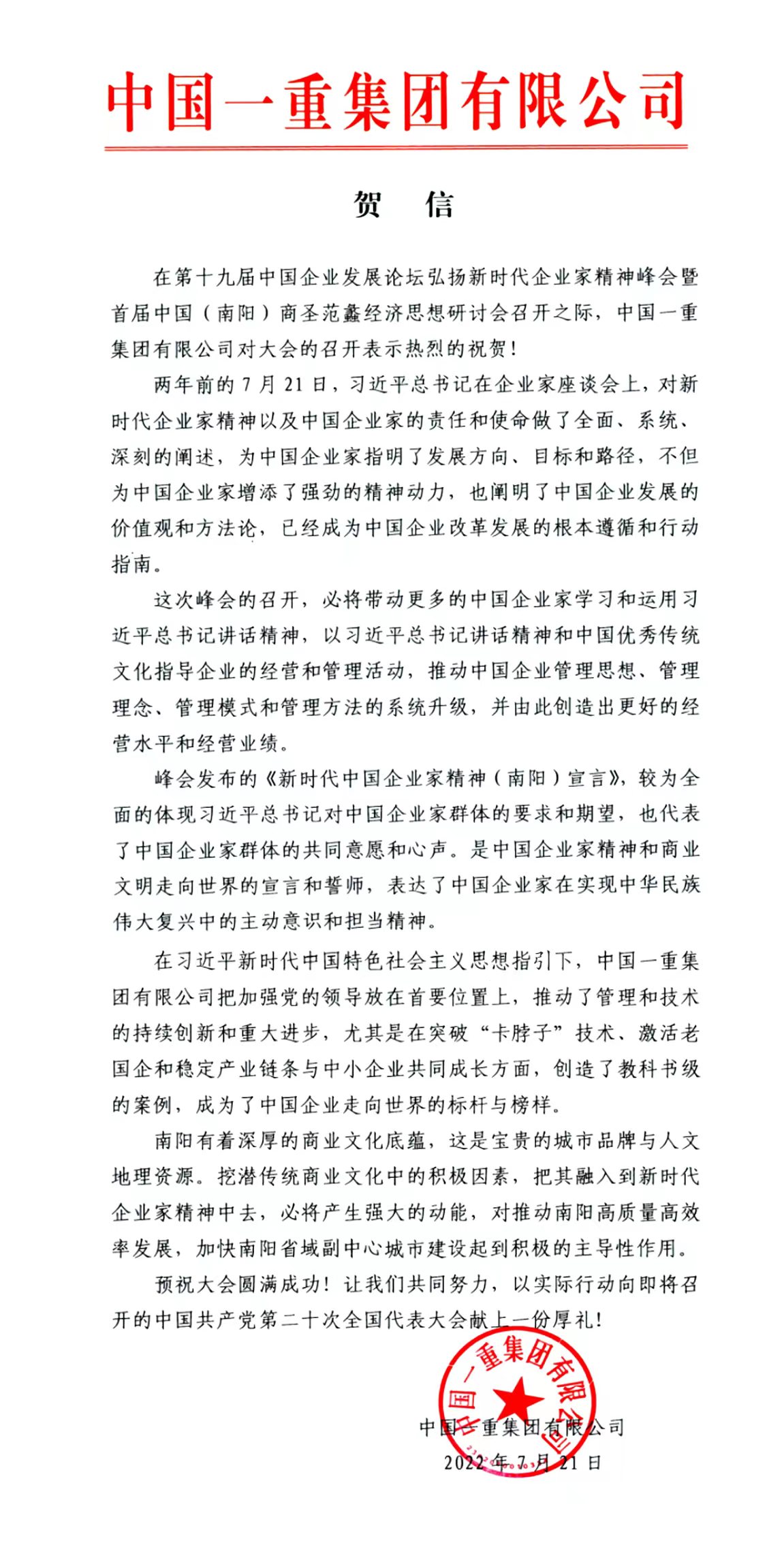 中國一重集團在賀信中表示,南陽有著深厚的商業文化底蘊,這是寶貴的城市品牌與人文地理資源。挖潛傳統商業文化中的積極因素,把其融入到新時代企業家精神中去,必將產生強大的動能,對推動南陽高質量高效率發展,加快南陽省域城市副中心建設起到積極的主導性作用。