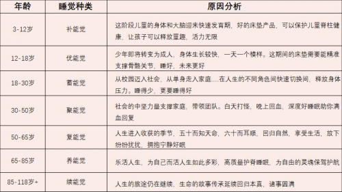 據了解,這8種覺囊括從新生到暮年的8個階段,每個階段根據人的身體發育需求、身體特征,結合所處年齡階段、社會環境等因素,來選擇不同的床墊,進而滿足人在每個階段好好睡覺的需求。