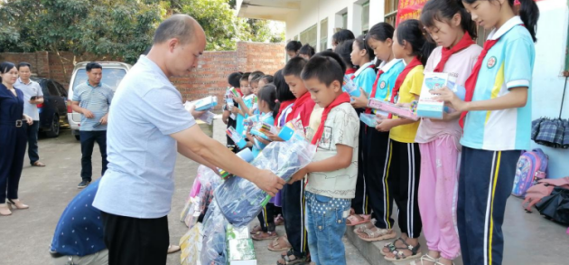 雙蟻藥業副總經理王洪向留守困境兒童分發學習用品