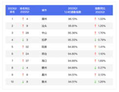 人口流動與交通的發展密不可分。同比2022第一季度,2023第一季度百城跨城遷徙規模指數都增,平均漲幅達到47.64%。最高漲幅城市為天津,漲幅達139.67%;北京、?安以漲幅116.20%、100.63%位居漲幅榜第二、第三。