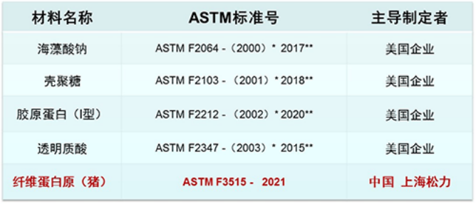 ASTM International自2000年以來,共批準發布了5個天然高分子材料的ASTM標準,前4個均形成了龐大的產業,且均為美國企業主導制訂。第5個為中國生物科技領軍企業-上海松力主導制訂