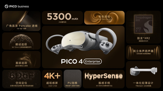 本次新品VR一體機PICO 4 Enterprise憑借強勁的性能,為用戶帶來更好的視覺體驗和更強的沉浸感。它采用的Pancake光學方案能夠實現105°超廣視野,精彩畫面盡收眼底。同時,其分辨率高達4320 x 2160的4K+超視感屏,最高可實現 90Hz 刷新率,更有1200 PPI的超清晰畫面表現,使呈現在眼前的場景絲毫畢現、栩栩如生,仿佛置身其中。此外,PICO 4 Enterprise還搭載驍龍?XR2芯片,配備256G存儲和8GB DDR5內存,使操作更快、更流暢,內置的5300mAh大容量電池滿足更長續航。