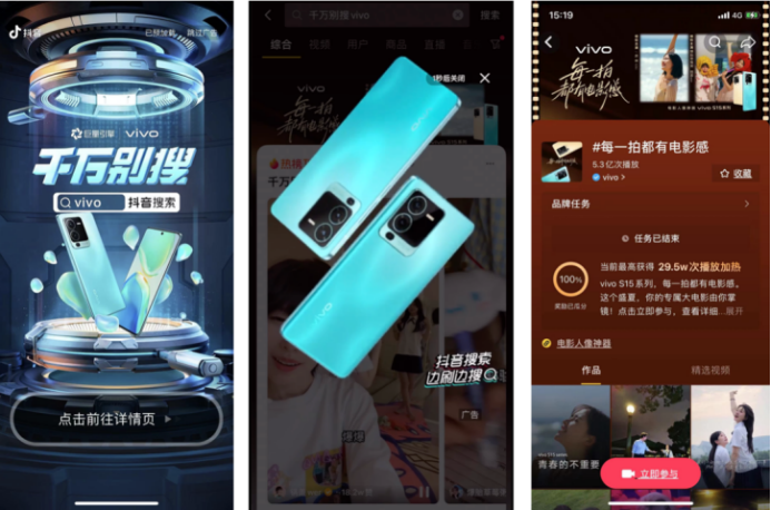 例如,在「千萬別搜」第一季中,vivo便通過兼具時(shí)尚感與科技感的創(chuàng)意開屏激發(fā)用戶點(diǎn)擊興趣,讓用戶通過點(diǎn)擊一鍵直達(dá)熱點(diǎn)品專并彈出彩蛋承接用戶興趣,進(jìn)一步聯(lián)動#每一拍都有電影感話題轉(zhuǎn)化經(jīng)營——通過這條完整的路徑,vivo實(shí)現(xiàn)話題頁5.3億曝光、全民任務(wù)播放量超穩(wěn)定播放區(qū)間最高值1.8倍的超預(yù)期佳績。