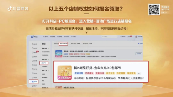 對于已入駐抖音電商且體驗分>4.5的商家,平臺帶來了五大店鋪權(quán)益。商家打開抖店-PC版后臺,進入營銷-活動廣場,即可報名領(lǐng)取相關(guān)權(quán)益。