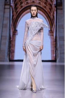 在充滿異域風情的“巴爾米拉女王”主題發(fā)布中,法國高定女裝設計師JadAdam攜手紹興永耀紡織品有限公司、紹興晶遠創(chuàng)意設計有限公司展現(xiàn)了尋找內(nèi)心平靜的啟蒙之旅的獨特過程。設計師從柯橋優(yōu)秀的面料中獲得啟發(fā),在華麗的禮服裙中采用了大量的刺繡及繡片繡珠工藝。兩家企業(yè)提供的閃光高密度歐根紗、銀色金屬絲、清透網(wǎng)眼等面料,花型立體簡潔、色彩透亮多變,為設計師帶來了豐富的靈感。從晚禮服、婚紗到高級時裝,JadAdam通過特有的藝術表現(xiàn)手法詮釋了本次禮服設計。