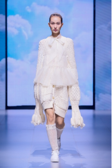 在“童年”主題秀演中,法國設計師聯(lián)袂浙江懿紗紡織科技有限公司、紹興柯橋豐旺紡織品有限公司,圍繞兒童的藝術、回到學校、童年的回憶三個子主題,共同演繹了童年的懷舊故事。設計師以精細的絎縫、印染、明線縫紉及自然著色的效果制作服裝和圖案,在工藝上采用了法國特有的編織技術,并結合WALTZ系列花紗、三醋酸、錦滌歐根紗、六角硬網(wǎng)等面料輕薄有型、色彩飽滿的特色,最大程度實現(xiàn)了紡織工藝的價值化。特別是在傳統(tǒng)手工藝非遺、生態(tài)環(huán)保材料等系列元素的加持下,為整場秀演增添了可持續(xù)時尚的價值。