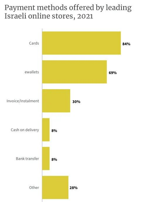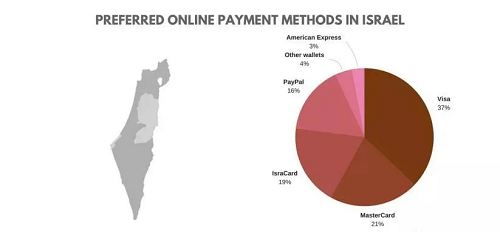以色列主要的支付方式包括Visa、MasterCard,Isracard(以色列本土支付方式),Paypal、Other Wallets和American Express。卡支付在以色列非常流行,TOP100的零售商中,84%提供信用卡支付,69%提供電子錢包支付,Visa和萬事達信用卡是當?shù)刈钍軞g迎的付款方式。