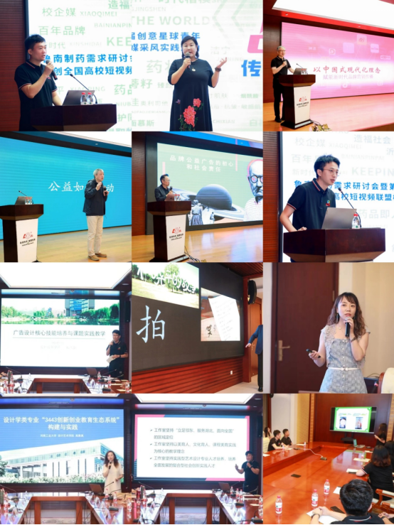 現場,湖北師范大學蔣達老師、山東工藝美術學院創新創業學院鄭建鵬老師、河南工業大學高雅真老師、蘇州大學劉英杰老師分別從高校美育改革與教學實踐創新、廣告設計核心技能培養、導師工作室教學培養、短視頻制作指導攻略進行主題分享。來自珠海科技學院黃鉦皓同學,圍繞“追尋自我”主題分享自己短視頻創作的歷程。