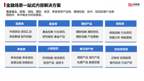 貝塔數據針對金融場景提供了一站式的內容解決方案,覆蓋基金、股票、保險、理財、信貸、養老等不同資產類別,并以投前、投中、投后的全過程為核心,為金融機構提供全面的客戶陪伴服務。