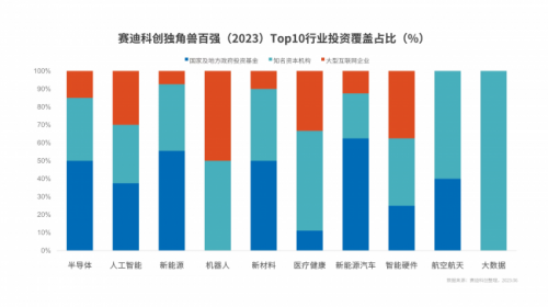 賽迪科創獨角獸百強(2023)中,獨角獸企業與國家及地方政府基金、知名資本機構、大型互聯網企業投資關聯度達到93%,分別投資覆蓋(含重復)了69家、65家、35家獨角獸百強,初步形成“知名資本+大型互聯網企業+政府投資”三方格局。其中,新能源汽車、新能源、半導體和新材料行業政府基金投資覆蓋均超過50%,成為最受關注的賽道。