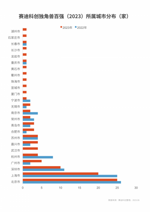 (二)城市格局:三強格局基本穩固,兩家以上獨角獸百強城市再度擴容
