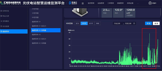 在整個(gè)臺(tái)風(fēng)過程中,匯耀品尚能源科技光伏電站智慧運(yùn)維監(jiān)測(cè)平臺(tái)起到了重要作用,對(duì)環(huán)境風(fēng)速變化、系統(tǒng)監(jiān)測(cè)狀態(tài),及時(shí)提供了實(shí)時(shí)數(shù)據(jù)。