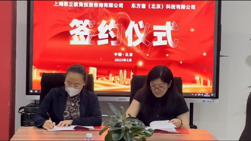 東方童(北京)科技有限公司文化傳媒事業部總經理尹健穎、上海昂立教育投資咨詢有限公司研學項目負責人金玫伶舉行簽約儀式