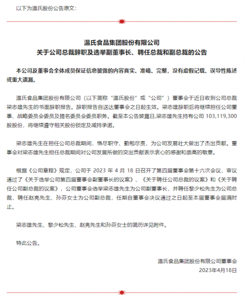 4月18日,溫氏股份第四屆董事會第十六次會議順利召開,會議由溫氏股份董事長溫志芬主持,全體董事參加會議,監(jiān)事列席。經(jīng)記名投票表決,會議審議通過了《關于選舉公司第四屆董事會副董事長的議案》《關于聘任公司總裁的議案》和《關于聘任公司副總裁的議案》三項議案。根據(jù)表決結果,梁志雄先生當選公司副董事長,聘任黎少松先生為公司總裁,聘任趙亮先生、孫芬女士為公司副總裁,任期自董事會決議通過之日起至本屆董事會屆滿時止。