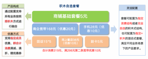 思特奇推出“積木式”商品自由組合解決方案并在移 動行業落地應用。以一個必選政企商品作為積木底座,N個可選熱門商品作為積木塊的模式,將單一政企業務復雜參數變為列表式的簡單勾選,解決政企業務參數復雜一線無法快速訂購的痛點,同時將融合優惠靈活分攤在各個商品上,提供滿減滿折多種優惠方式,解決了優惠模式單一的痛點。實現資費標準透明,現場即辦即走。