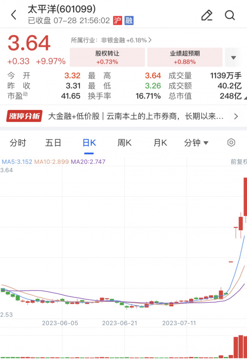 同時,太平洋證券稱,公司股票在2023年7月25日、7月26日、7月27日連續三個交易日內收盤價格漲幅偏離值累計達到20%,屬于股票交易異常波動情形。