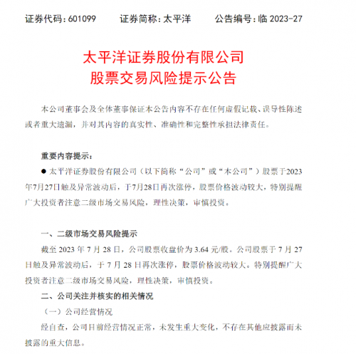 7月28日,太平洋證券發布股票交易風險提示公告,公司股票于2023年7月27日觸及異常波動后,于7月28日再次漲停,股票價格波動較大,特別提醒廣大投資者注意二級市場交易風險,理性決策,審慎投資。