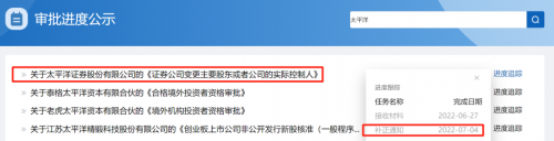 證監會政務服務平臺顯示,太平洋證券主要股東或者公司的實控人變更仍處于補正通知狀態,該狀態的完成日期為“2022-07-04”,接收材料時間為“2022-06-27”。