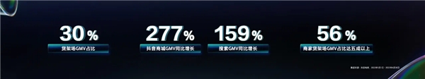 2023抖音電商生態大會數據顯示:從2022年5月1日至今年4月30日抖音商城中,貨架場GMV占比達到30%,搜索的GMV同比增長159%,有56%的商家貨架場GMV占比超過50%。