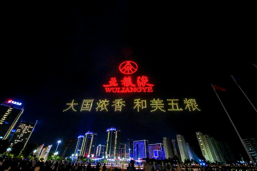 2023世界品牌莫干山大會舉行期間,五糧液品牌LOGO組成的無人機燈光秀讓與會嘉賓印象深刻