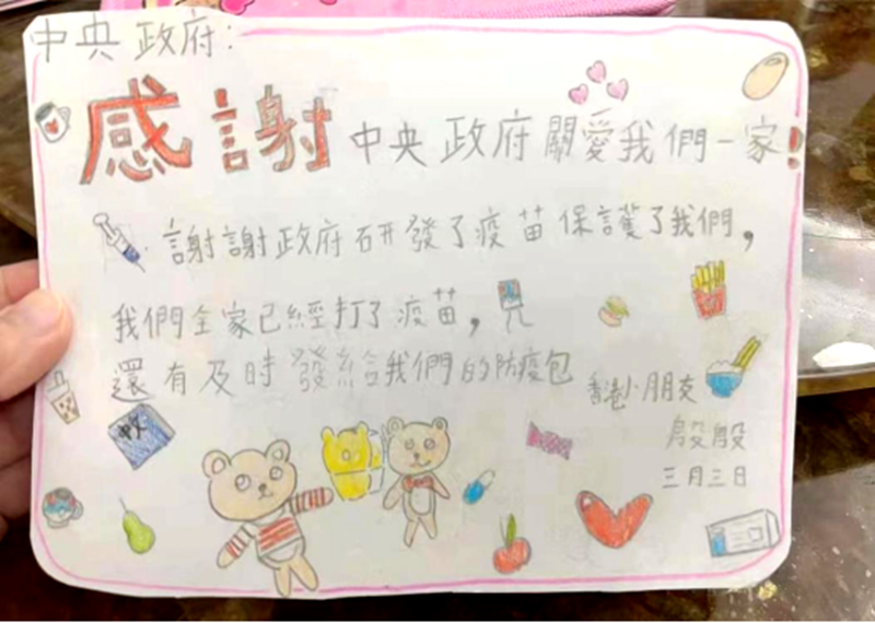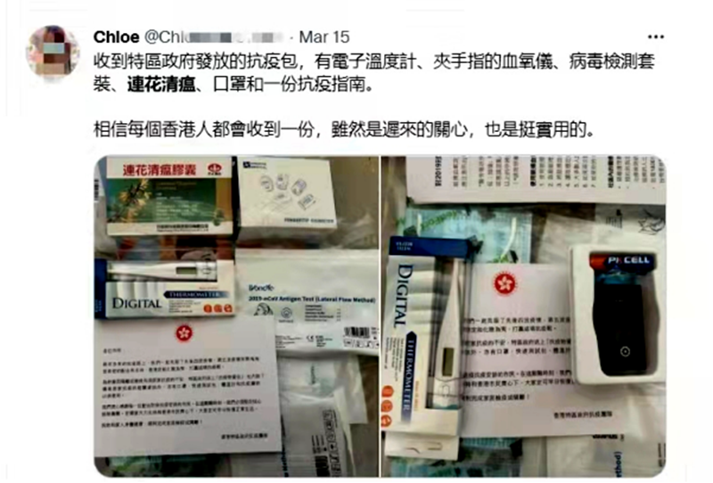 “收到特區政府發放的抗疫包,有電子溫度計、夾手指的血氧儀、病毒檢測套裝、連花清瘟膠囊、口罩和一份抗疫指南,挺實用的。”近日,一名居家隔離的香港居民收到政府派發的“抗疫物資包”后,在社交平臺開心的曬出圖文。更早前,一位叫殷殷的香港小朋友用自己手寫的感謝信,表達了對中央政府為香港市民提供防疫物資的感謝。隨著疫情防控的逐步深入,一個個像這樣滿載關愛的“抗疫包”越來越快地出現在人們手中。
