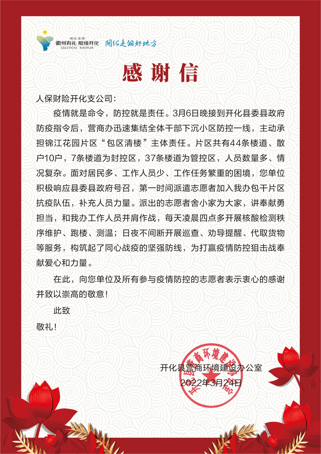 開化縣營商環境建設辦公室為開化人保財險支持抗疫送上的感謝信。