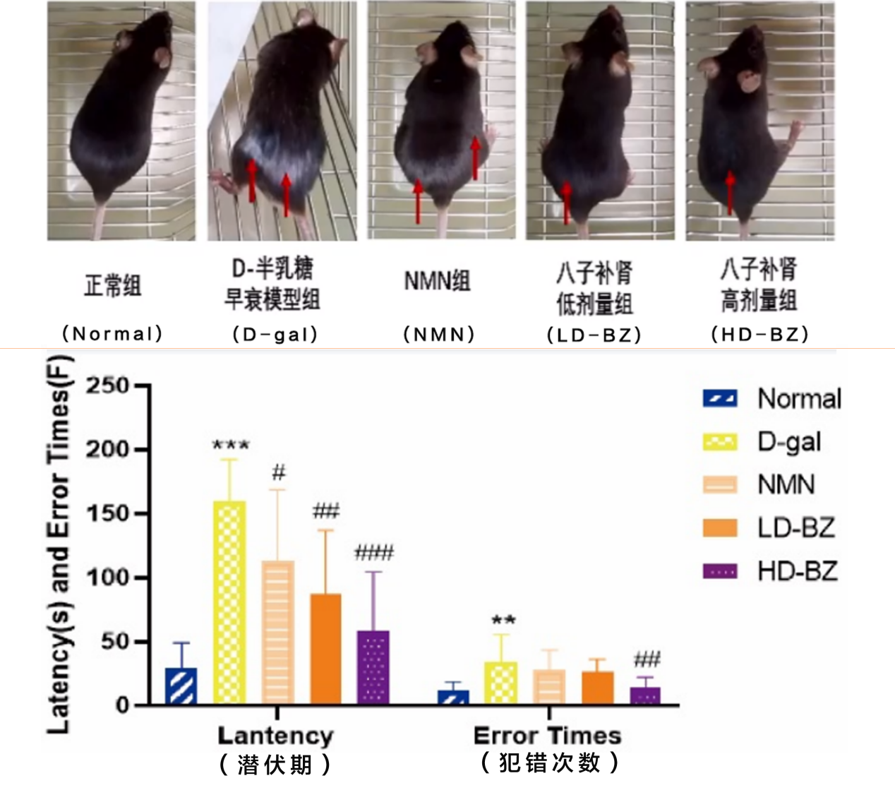 北京中醫(yī)藥大學(xué)科研人員采用D-gal誘導(dǎo)衰老小鼠模型,連續(xù)給藥60日,評價八子補腎膠囊改善腦功能的效果及作用機制。巴恩斯迷宮實驗結(jié)果表明,八子補腎組小鼠在縮短逃避潛伏期、減少犯錯次數(shù)上均有明顯作用(P<0.001;P<0.01)。
