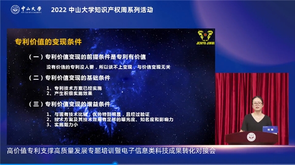 2022年4月28日,在中山大學的全程指導及越秀區政府的鼎力支持下,中山大學科學研究院、廣州高新區黃花崗科技園管委會、中山大學圖書館、廣州中大知識產權服務有限公司共同成功主辦中山大學知識產權周系列活動高價值專利支撐高質量發展專題培訓暨電子信息類科技成果轉化對接會。本次活動采取線上方式開展,邀請兩位業界專家圍繞高價值專利支撐高質量發展做專題報告,多達178項電子信息類專利項目與83家企業進行了精準對接,活動在線人數超2.2萬人,多位知識產權專家及知名企業在云端匯聚,助力知識產權高質量發展。