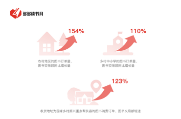 自2014年起,“全民閱讀”連續9次被寫入政府工作報告。據拼多多此前發布的《2021多多閱讀報告》調查數據,在第一、第二季“多多讀書月”活動期間,來自農村地區的圖書訂單量、圖書交易額同比增長超過154%,來自鄉村中小學的圖書訂單量、圖書交易額同比增長超過110%。